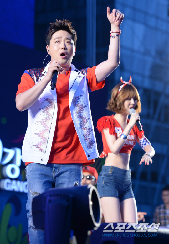 한국과 러시아의 2014 브라질 월드컵 첫 경기가 예정된 18일 새벽 서울 영동대로에서 길거리 응원전이 펼쳐졌다. 박현빈이 멋진 무대를 펼치고 있다.