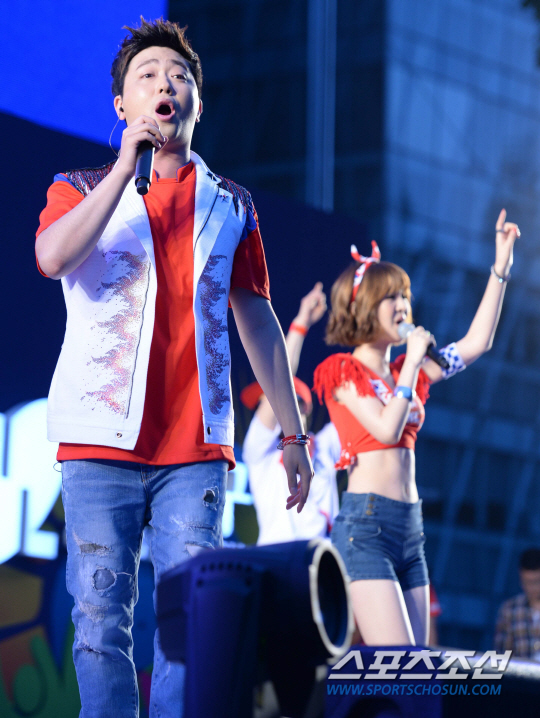 한국과 러시아의 2014 브라질 월드컵 첫 경기가 예정된 18일 새벽 서울 영동대로에서 길거리 응원전이 펼쳐졌다. 박현빈이 멋진 무대를 펼치고 있다.