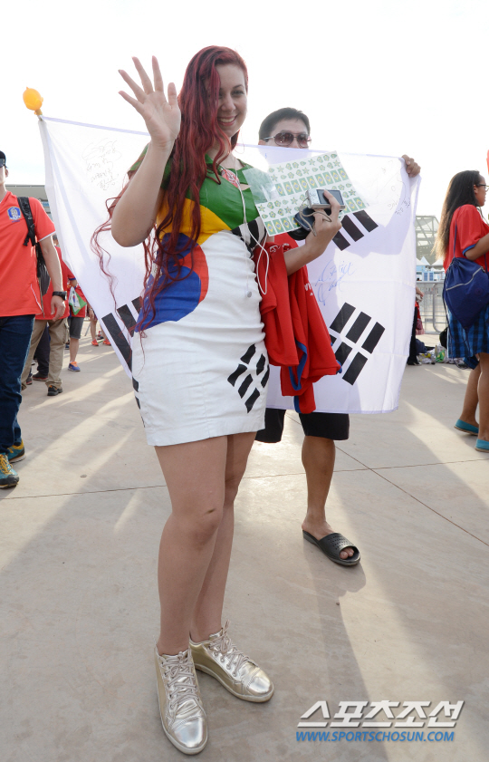 2014 브라질월드컵 조별예선 H조 1차전 한국과 러시아의 경기가 18일 오전 (한국시간) 쿠이아바 아레나 판타날 경기장에서 열렸다. 경기를 관전하러 온 한 여성팬이 태극기로 만든 옷을 입고 입장하고 있다.