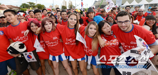 2014 브라질월드컵 조별예선 H조 1차전 한국과 러시아의 경기가 18일 오전 (한국시간) 쿠이아바 아레나 판타날 경기장에서 열렸다. 경기를 관전하러 붉은 악마들이 열정적인 응원전을 펼치며 입장하고 있다.