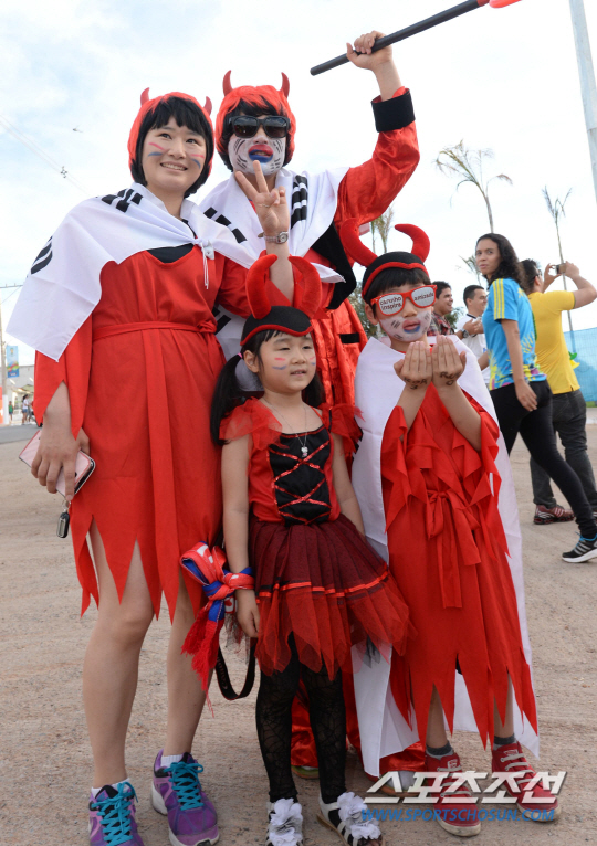 2014 브라질월드컵 조별예선 H조 1차전 한국과 러시아의 경기가 18일 오전 (한국시간) 쿠이아바 아레나 판타날 경기장에서 열렸다. 붉은악마로 분장한 한국팬 가족이 경기장에 입장하고 있다.