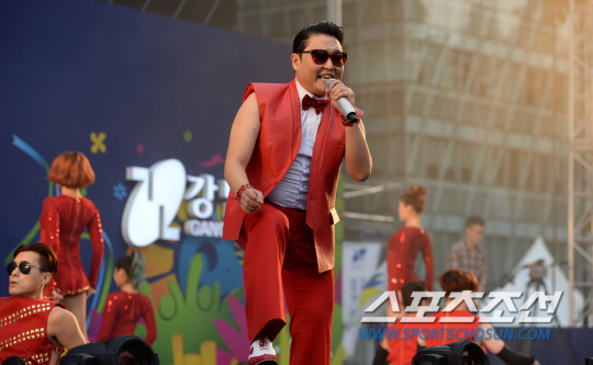 한국과 러시아의 2014 브라질 월드컵 첫 경기가 예정된 18일 새벽 서울 영동대로에서 길거리 응원전이 펼쳐졌다. 싸이가 멋진 무대를 펼치고 있다.