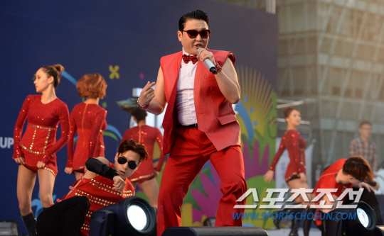 한국과 러시아의 2014 브라질 월드컵 첫 경기가 예정된 18일 새벽 서울 영동대로에서 길거리 응원전이 펼쳐졌다. 싸이가 멋진 무대를 펼치고 있다.