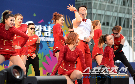 한국과 러시아의 2014 브라질 월드컵 첫 경기가 예정된 18일 새벽 서울 영동대로에서 길거리 응원전이 펼쳐졌다. 싸이가 멋진 무대를 펼치고 있다.
