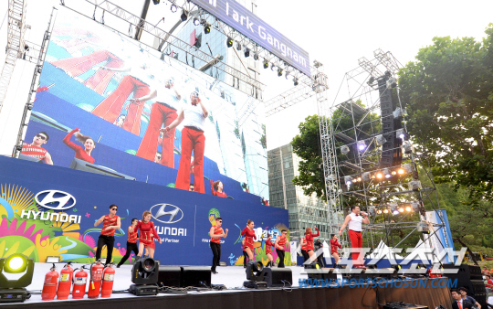 한국과 러시아의 2014 브라질 월드컵 첫 경기가 예정된 18일 새벽 서울 영동대로에서 길거리 응원전이 펼쳐졌다. 싸이가 멋진 무대를 펼치고 있다.