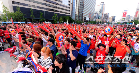 18일 오전 서울 광화문광장에서 브라질 월드컵 조별예선 첫 경기 한국 대 러시아 전을 맞아 월드컵 거리응원이 펼쳐졌다. 거리응원전은 서울 광화문광장과 영동대로를 비롯해 전국 20여곳에서 펼쳐졌다. 열띤 응원을 펼치고 있는 시민들.