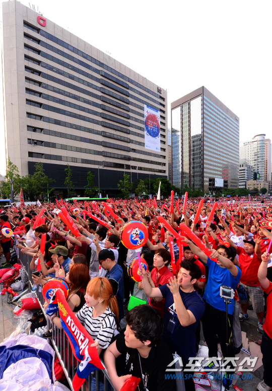18일 오전 서울 광화문광장에서 브라질 월드컵 조별예선 첫 경기 한국 대 러시아 전을 맞아 월드컵 거리응원이 펼쳐졌다. 거리응원전은 서울 광화문광장과 영동대로를 비롯해 전국 20여곳에서 펼쳐졌다. 열띤 응원을 펼치고 있는 시민들.