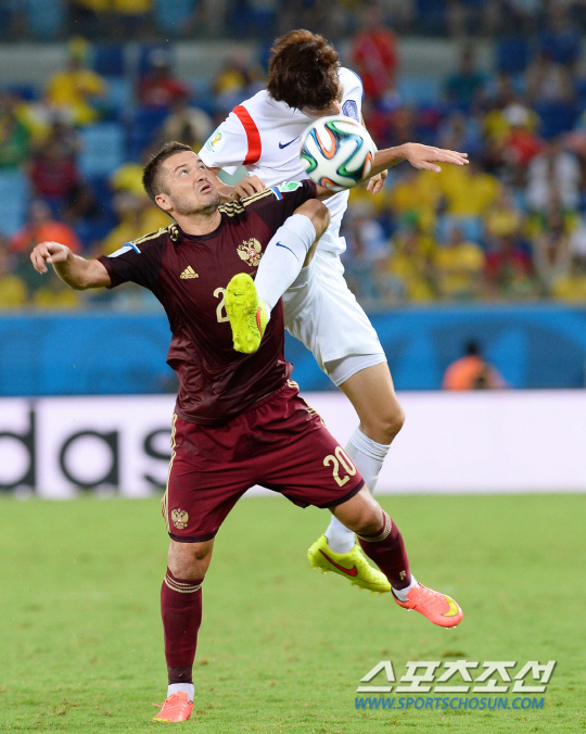 2014 브라질월드컵 조별예선 H조 1차전 한국과 러시아의 경기가 18일 오전 (한국시간) 쿠이아바 아레나 판타날 경기장에서 열렸다.한국의 한국영이 러시아 화이줄린과 치열한 볼경합을 벌이고 있다.