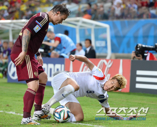 2014 브라질월드컵 조별예선 H조 1차전 한국과 러시아의 경기가 18일 오전 (한국시간) 쿠이아바 아레나 판타날 경기장에서 열렸다. 한국의 손흥민이 러시아 에첸코와 치열한 볼경합을 벌이고 있다.