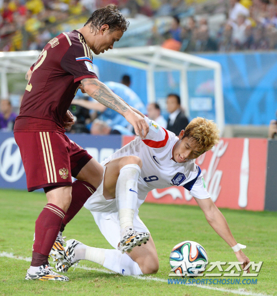 2014 브라질월드컵 조별예선 H조 1차전 한국과 러시아의 경기가 18일 오전 (한국시간) 쿠이아바 아레나 판타날 경기장에서 열렸다. 한국의 손흥민이 러시아 에첸코와 치열한 볼경합을 벌이고 있다.