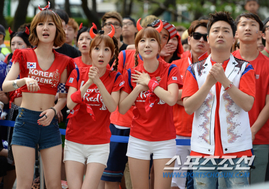 한국과 러시아의 2014 브라질 월드컵 첫 경기가 예정된 18일 오전 서울 영동대로에서 길거리 응원전이 펼쳐졌다. 윤수현, 윙크, 박현빈이 경기를 지켜보고 있다.