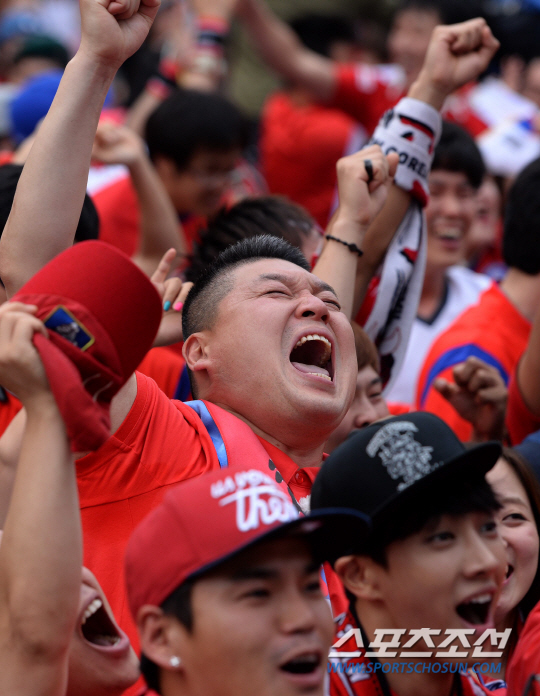18일 오전 서울 광화문광장에서 브라질 월드컵 조별예선 첫 경기 한국 대 러시아 전을 맞아 월드컵 거리응원이 펼쳐졌다. 거리응원전은 서울 광화문광장과 영동대로를 비롯해 전국 20여곳에서 펼쳐졌다. 후반 이근호의 선취골이 터지자 환호하고 있는 응원단. 강호동이 환호하고 있다.