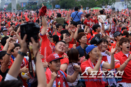 18일 오전 서울 광화문광장에서 브라질 월드컵 조별예선 첫 경기 한국 대 러시아 전을 맞아 월드컵 거리응원이 펼쳐졌다. 거리응원전은 서울 광화문광장과 영동대로를 비롯해 전국 20여곳에서 펼쳐졌다. 후반 이근호의 선취골이 터지자 환호하고 있는 응원단.