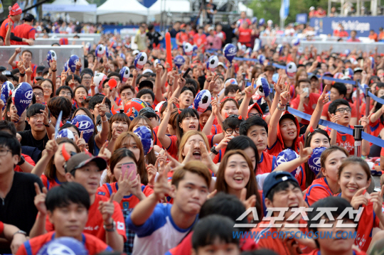 한국과 러시아의 2014 브라질 월드컵 첫 경기가 예정된 18일 오전 서울 영동대로에서 길거리 응원전이 펼쳐졌다. 경기를 지켜보는 시민들의 모습.