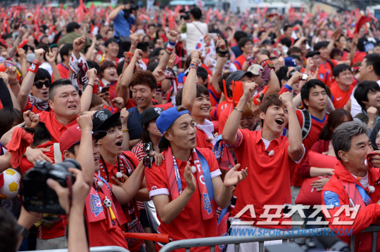 18일 오전 서울 광화문광장에서 브라질 월드컵 조별예선 첫 경기 한국 대 러시아 전을 맞아 월드컵 거리응원이 펼쳐졌다. 거리응원전은 서울 광화문광장과 영동대로를 비롯해 전국 20여곳에서 펼쳐졌다. 후반 이근호의 선취골이 터지자 환호하고 있는 응원단.