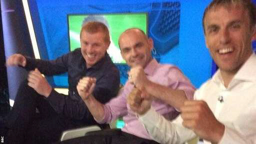 대한민국과 러시아의 브라질월드컵 첫 경기에서 이근호의 선제골이 터지자 영국 공영방송 BBC 해설진이 스튜디오에서 환호하는 모습이 눈길을 끌고 있다.