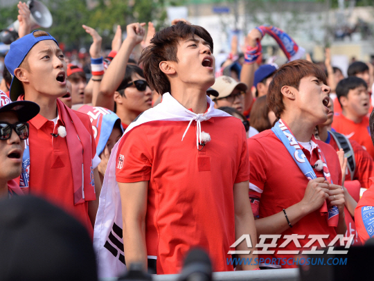 홍명보 호가 브라질 월드컵 러시아 전에서 1대1로 무승부를 기록 했다. 18일 오전 서울 광화문광장에서 한국 대 러시아 전을 관전하기 위해 월드컵 거리응원이 펼쳐졌다. 거리응원전은 서울 광화문광장과 영동대로를 비롯해 전국 20여곳에서 펼쳐졌다. 동점을 허용하자 아쉬워하고 있는 샤이니 민호.