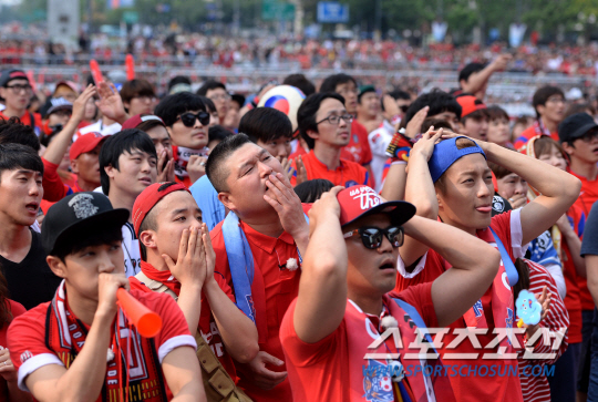 홍명보 호가 브라질 월드컵 러시아 전에서 1대1로 무승부를 기록 했다. 18일 오전 서울 광화문광장에서 한국 대 러시아 전을 관전하기 위해 월드컵 거리응원이 펼쳐졌다. 거리응원전은 서울 광화문광장과 영동대로를 비롯해 전국 20여곳에서 펼쳐졌다. 동점골을 허용하자 아쉬운 표정을 짓고 있는 붉은악마 응원단.