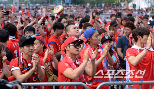 홍명보 호가 브라질 월드컵 러시아 전에서 1대1로 무승부를 기록 했다. 18일 오전 서울 광화문광장에서 한국 대 러시아 전을 관전하기 위해 월드컵 거리응원이 펼쳐졌다. 거리응원전은 서울 광화문광장과 영동대로를 비롯해 전국 20여곳에서 펼쳐졌다. 경기 종료 후 태극전사들에게 박수를 보내고 있는 붉은악마 응원단.