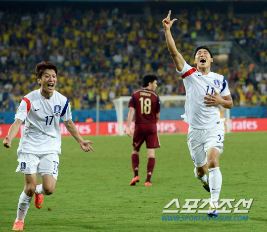 2014 브라질월드컵 조별예선 H조 1차전 한국과 러시아의 경기가 18일 오전 (한국시간) 쿠이아바 아레나 판타날 경기장에서 열렸다. 한국의 이근호가 팀의 첫번째 골을 성공시키고 환호하고 있다.