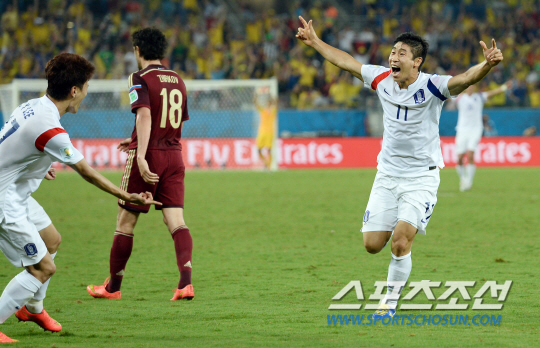 2014 브라질월드컵 조별예선 H조 1차전 한국과 러시아의 경기가 18일 오전 (한국시간) 쿠이아바 아레나 판타날 경기장에서 열렸다. 한국의 이근호가 팀의 첫번째 골을 성공시키고 환호하고 있다.