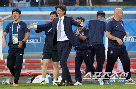2014 브라질월드컵 조별예선 H조 1차전 한국과 러시아의 경기가 18일 오전 (한국시간) 쿠이아바 아레나 판타날 경기장에서 열렸다. 홍명보 감독이 이근호의 선제골에 코치진과 환호하고 있다.