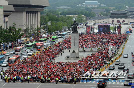 18일 오전 서울 광화문 광장에 브라질 월드컵 조별리그 H조 러시아와의 1차전 응원을 나온 시민들이 이근호의 첫골이 터지자 환호하고 있다. 2014.6.18/사진공동취재단