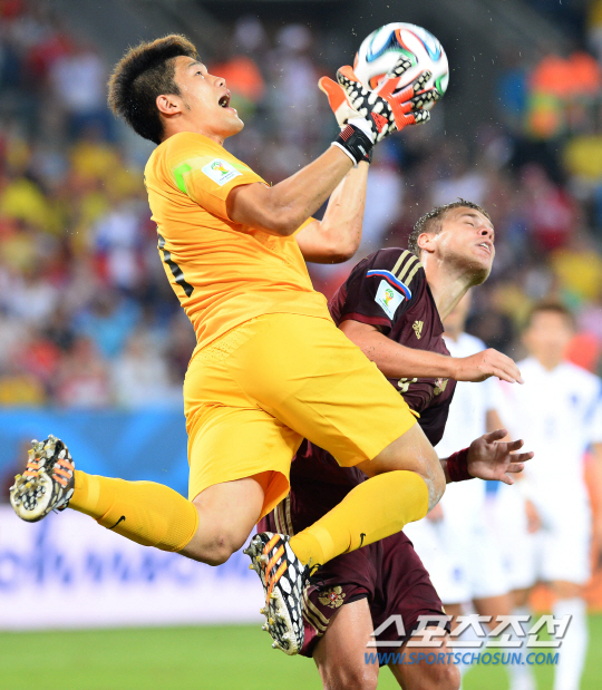 2014 브라질월드컵 조별예선 H조 1차전 한국과 러시아의 경기가 18일 오전 (한국시간) 쿠이아바 아레나 판타날 경기장에서 열렸다. 한국의 골키퍼 정성룡이 러시아 코코린과 치열한 볼경합을 벌이고 있다.