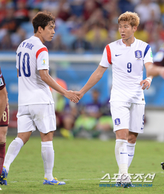 2014 브라질월드컵 조별예선 H조 1차전 한국과 러시아의 경기가 18일 오전 (한국시간) 쿠이아바 아레나 판타날 경기장에서 열렸다. 박주영과 손흥민이 경기중 손을 맞잡으며 전의를 다지고 있다.