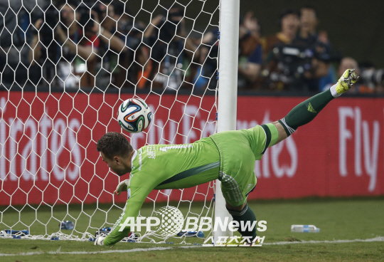 2014 브라질 월드컵 H조 예선 한국과 러시아 경기에서 후반 러시아 골키퍼 아킨페프가 한국 이근호의 슛을 막다 골을 허용하고 있다. 한국은 6분후 알렉산드르 케자르코프에게 동점골을 허용 1대1 무승부를 기록했다.