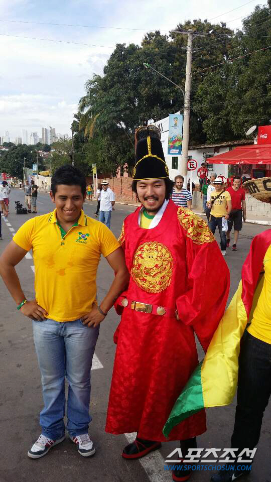이들 옆에는 '세종대왕'이 현지인들의 사진촬영 요청에 즐거운 비명을 지르고 있었다. 물론 세종대왕이 환생한 것은 아니었다. 브라질 유학생인 김필만씨(28)가 주인공이었다. 명지대 재학 중 교환학생으로 지난 3월 브라질에 온 김씨는 "브라질에 한국을 알리고 싶어 학교 발표수업 때 세종대왕을 테마로 분장을 하고 옷을 입었더니 반응이 좋았다. 특별한 응원을 위해 같은 복장을 했다"고 밝혔다. 세종대왕 테마를 완성하기 위해 1달 간 수염을 기른 효과를 톡톡히 봤다는 김씨는 "브라질에서 한국 축구의 힘을 보여주기 바란다"며 다시 현지인들 속으로 사라졌다. 김씨 외에도 갓과 도포를 갖춘 조선시대 선비 복장을 하고 아레나 판타날을 찾은 한 팬은 러시아 미녀와 '셀카(셀프카메라)' 삼매경에 빠진 모습이 포착되어 웃음을 자아냈다.
