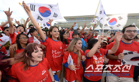 2014 브라질월드컵 조별예선 H조 1차전 한국과 러시아의 경기가 18일 오전 (한국시간) 쿠이아바 아레나 판타날 경기장에서 열렸다. 경기를 관전하러 붉은 악마들이 열정적인 응원전을 펼치며 입장하고 있다. 쿠이아바(브라질)=최문영 기자 deer@sportschosun.com /2014.06.18/