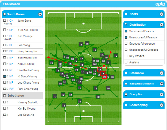 이 데이터는 기성용이 중원에서 상대를 압도했기 때문에 한국이 큰 위기 없이 쉽게 공격에 나설 수 있었다는 사실을 입증한다. <스포츠조선닷컴>
