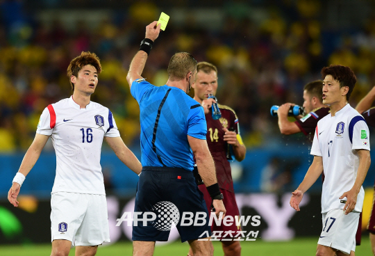 | ◇기성용이 경고를 받자 이청용이 항의하고 있다. 쿠이아바(브라질)=ⓒAFPBBNews = News1 |