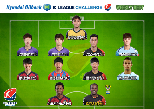 공격수 부문에는 조엘손과 함께 '대전의 득점머신' 아드리아노가 선정됐다. 베스트 미드필더에는 조나탄(대구) 한석종(강원) 권용현(수원FC) 황진산(대전)이, 최고 수비수로는 이준희(대구) 김오규(강원) 박 민 김태봉(이상 안양)이 뽑혔다. 강원의 황교충이 베스트골키퍼가 됐다.