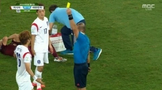 18일 오전(이하 한국시간) 열린 2014년 브라질월드컵 H조 1차전 러시아와의 경기에서 대한민국은 1대1 무승부 경기를 펼쳤다. 이날 경기에서 전반 13분 손흥민, 전반 30분 기성용, 종료 직전 구자철이 경고를 받으며 세 장의 경고를 얻었다.