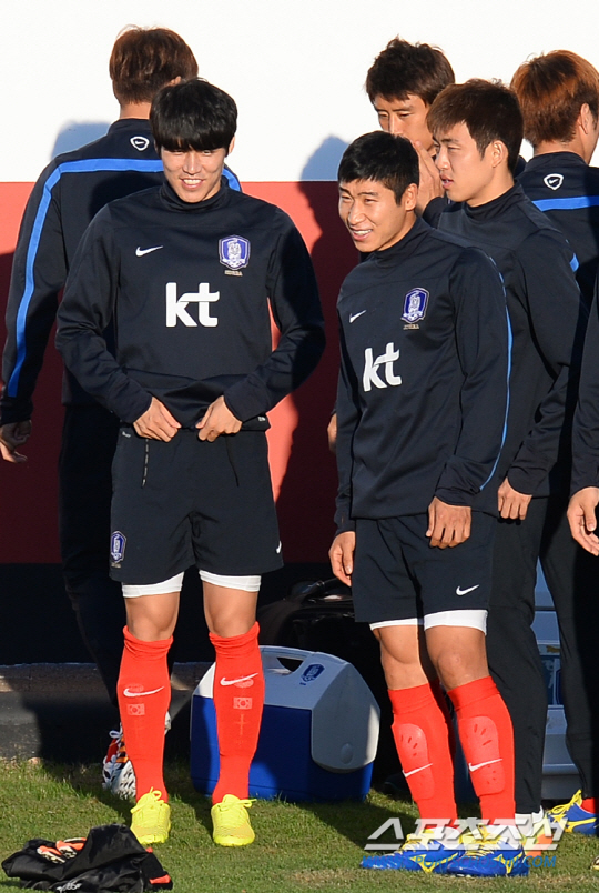 2014 브라질월드컵 조별예선 1차전에서 러시아를 상대로 1대1 무승부를 거둔 홍명보호가 19일 오전(한국시간) 훈련캠프인 이구아수 플라멩고 경기장에 도착해 회복훈련을 실시했다. 이근호와 김창수가 웃으면서 훈련을 준비하고 있다.