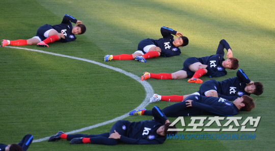 2014 브라질월드컵 조별예선 1차전에서 러시아를 상대로 1대1 무승부를 거둔 홍명보호가 19일 오전(한국시간) 훈련캠프인 이구아수 플라멩고 경기장에 도착해 회복훈련을 실시했다. 이근호와 김보경이 스트레칭으로 몸을 풀고 있다.