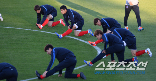 2014 브라질월드컵 조별예선 1차전에서 러시아를 상대로 1대1 무승부를 거둔 홍명보호가 19일 오전(한국시간) 훈련캠프인 이구아수 플라멩고 경기장에 도착해 회복훈련을 실시했다. 이근호와 김보경이 스트레칭으로 몸을 풀고 있다.
