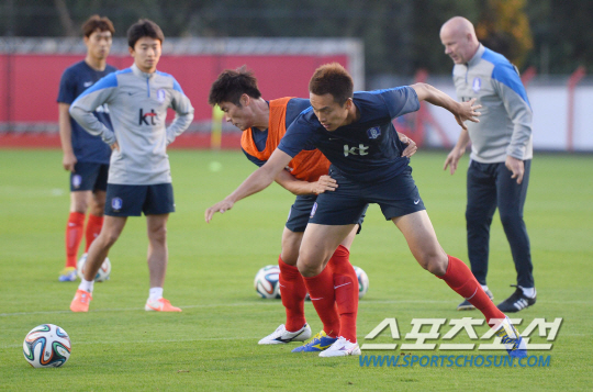 2014 브라질월드컵 조별예선 1차전에서 러시아를 상대로 1대1 무승부를 거둔 홍명보호가 19일 오전(한국시간) 훈련캠프인 이구아수 플라멩고 경기장에 도착해 회복훈련을 실시했다. 김신욱과 황석호가 미니게임에 열중하고 있다.