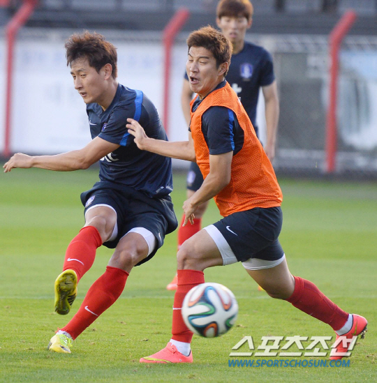 2014 브라질월드컵 조별예선 1차전에서 러시아를 상대로 1대1 무승부를 거둔 홍명보호가 19일 오전(한국시간) 훈련캠프인 이구아수 플라멩고 경기장에 도착해 회복훈련을 실시했다. 지동원과 박주호가 미니게임에 열중하고 있다.