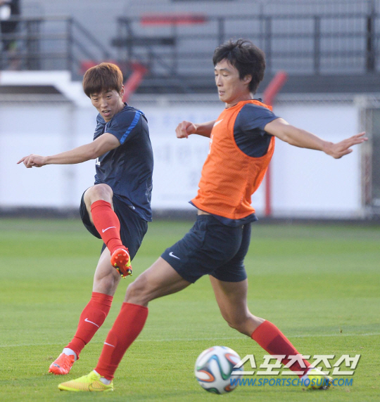 2014 브라질월드컵 조별예선 1차전에서 러시아를 상대로 1대1 무승부를 거둔 홍명보호가 19일 오전(한국시간) 훈련캠프인 이구아수 플라멩고 경기장에 도착해 회복훈련을 실시했다. 김보경과 곽태휘가 미니게임에 열중하고 있다.