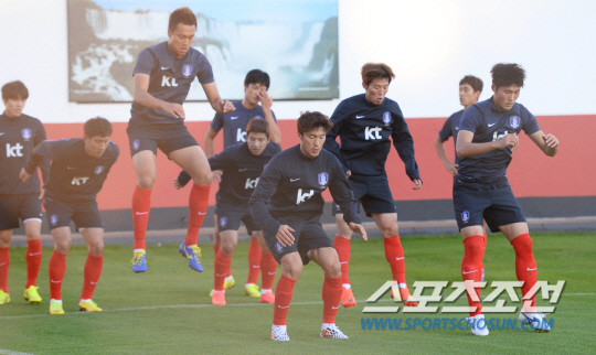 2014 브라질월드컵 조별예선 1차전에서 러시아를 상대로 1대1 무승부를 거둔 홍명보호가 19일 오전(한국시간) 훈련캠프인 이구아수 플라멩고 경기장에 도착해 회복훈련을 실시했다. 태극전사들이 코어트레이닝으로 근력을 다지고 있다.