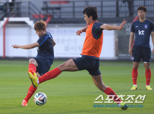 2014 브라질월드컵 조별예선 1차전에서 러시아를 상대로 1대1 무승부를 거둔 홍명보호가 19일 오전(한국시간) 훈련캠프인 이구아수 플라멩고 경기장에 도착해 회복훈련을 실시했다. 김보경과 곽태휘가 슈팅훈련에 열중하고 있다.
