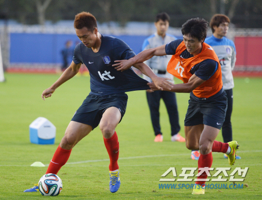 2014 브라질월드컵 조별예선 1차전에서 러시아를 상대로 1대1 무승부를 거둔 홍명보호가 19일 오전(한국시간) 훈련캠프인 이구아수 플라멩고 경기장에 도착해 회복훈련을 실시했다. 김신욱과 곽태휘가 미니게임에 열중하고 있다.