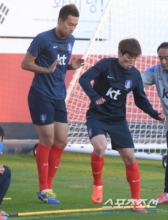 2014 브라질월드컵 조별예선 1차전에서 러시아를 상대로 1대1 무승부를 거둔 홍명보호가 19일 오전(한국시간) 훈련캠프인 이구아수 플라멩고 경기장에 도착해 회복훈련을 실시했다. 김신욱과 김보경이 코어트레이닝으로 근력을 다지고 있다.