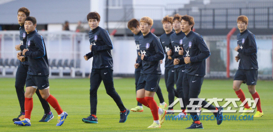 2014 브라질월드컵 조별예선 1차전에서 러시아를 상대로 1대1 무승부를 거둔 홍명보호가 19일 오전(한국시간) 훈련캠프인 이구아수 플라멩고 경기장에 도착해 회복훈련을 실시했다. 태극전사들이 가벼운 러닝을 하며 회복훈련에 열중하고 있다.