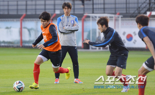 2014 브라질월드컵 조별예선 1차전에서 러시아를 상대로 1대1 무승부를 거둔 홍명보호가 19일 오전(한국시간) 훈련캠프인 이구아수 플라멩고 경기장에 도착해 회복훈련을 실시했다. 홍명보 감독이 미니게임을 하는 선수들을 지켜보고 있다.