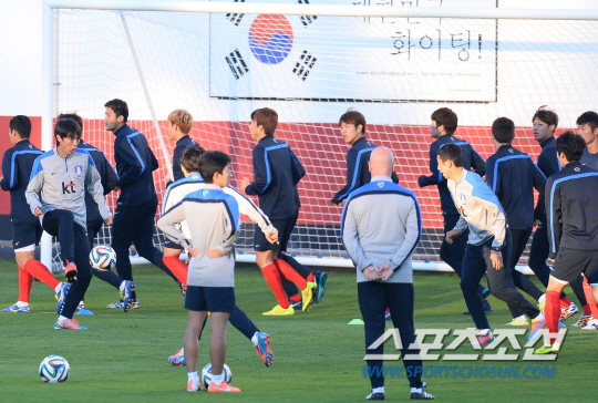 2014 브라질월드컵 조별예선 1차전에서 러시아를 상대로 1대1 무승부를 거둔 홍명보호가 19일 오전(한국시간) 훈련캠프인 이구아수 플라멩고 경기장에 도착해 회복훈련을 실시했다. 홍명보 감독이 선수들과 볼뺏기 게임을 하고있다.