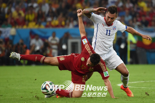 | 스페인이 무너졌다. 19일 스페인-칠레의 경기 모습. ⓒAFPBBNews = News1 |